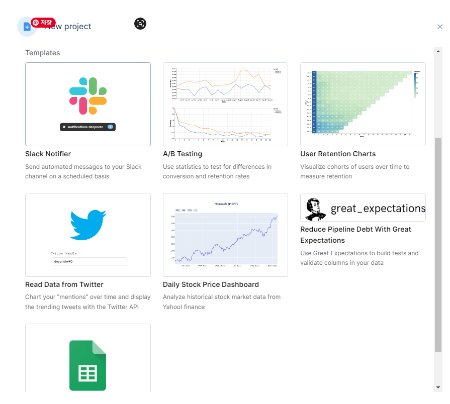 흥미로운 점은 새 프로젝트에 다양한 데이터 프로젝트를 만들 수 있는 템플릿이 있다는 것이다.