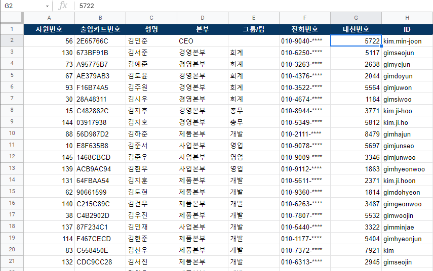 아래와 같이 A열의 데이터인 내선번호 데이터와 동일한 값을 가신 row들의 수를 구할 수 있다. 키값이 항상 왼쪽에 있어야 찾을 수 있는 VLOOKUP를 보완하여 INDEX와 MATCH를 사용할 수 있다고 한다.