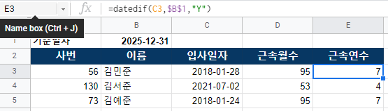 우선 입사일와 기준일자 사이 얼마간의 기간의 차이가 있는지 구해보자. 이를위해 datedif 함수를 사용하면 되는데, datedif는 date difference의 약자다. 아래와 같이 근속월수를 구해두었다.