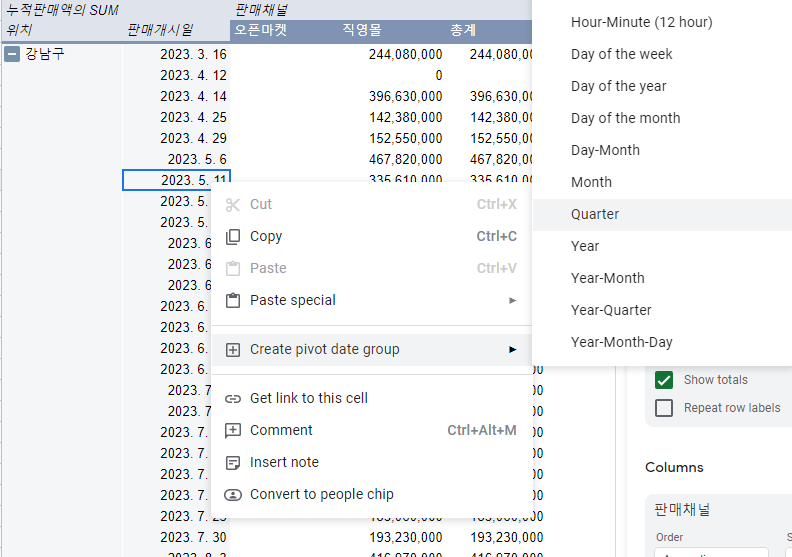 아래와 같이 판매개시일 날짜 데이터에서 오른쪽 클릭을 하면 피봇 날짜들을 그루핑할 수 있는 옵션이 나타난다. 다른 컬럼에서는 이 옵션이 보이지 않는다. 여기서 년 단위로 그루핑을 해주자.