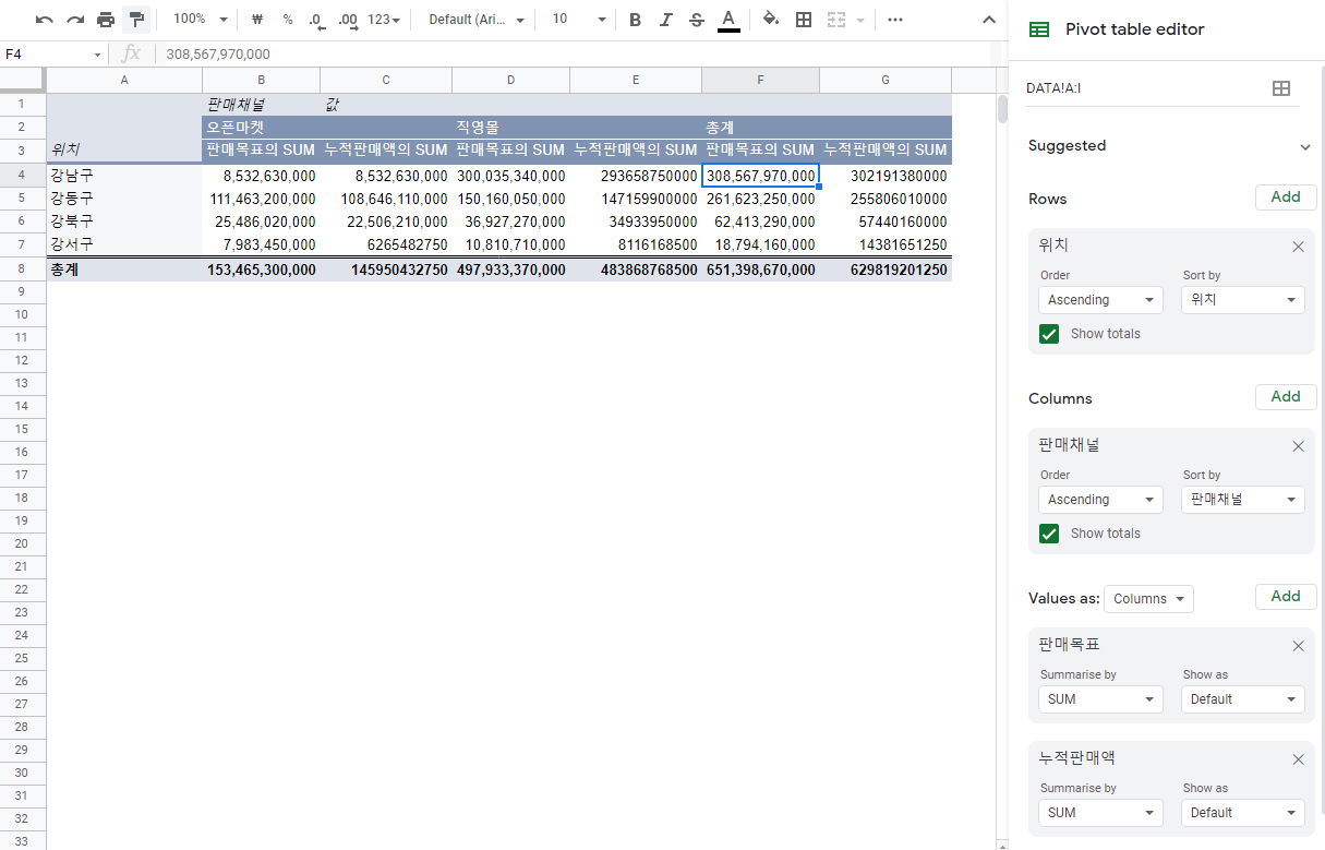 위 테이블에서 판매목표 값을 추가 해주었더니 아래와 같이 하나의 column이 column-A, column-B로 쪼개지면서 두 가지 관점의 데이터를 볼 수 있게 되었다. 종종 비즈니스 상황에서 이런 테이블을 만들어야 하는 경우가 생기는데, 직접 만들게 되면 해당 테이블을 지속 가능하게 활용하기 어려운데, 피벗 테이블을 사용하면 쉽게 구현할 수 있어 유용하다고 생각한다.