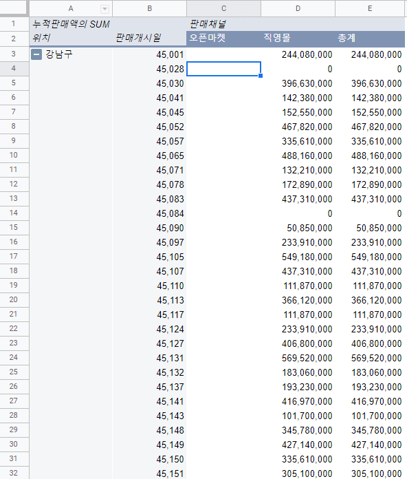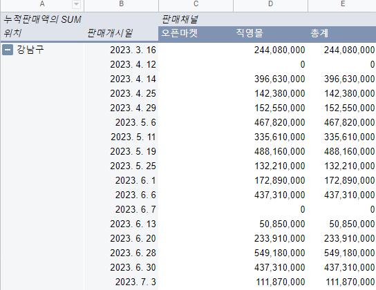 아래와 같이 판매개시일 column이 새로 생기면서 각 구별 데이터들이 판매개시일 별 데이터들로 세부화되어 나타났다.