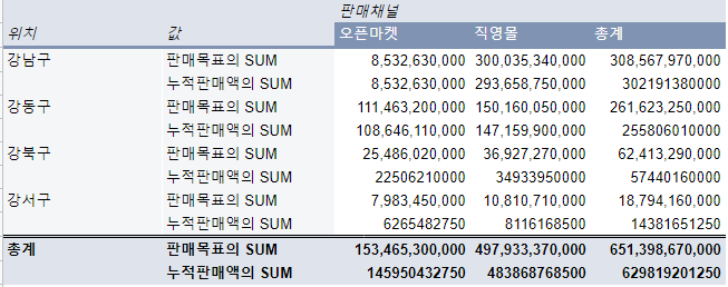 피벗 테이블을 써서 두 가지 기준으로 데이터 합계 내기