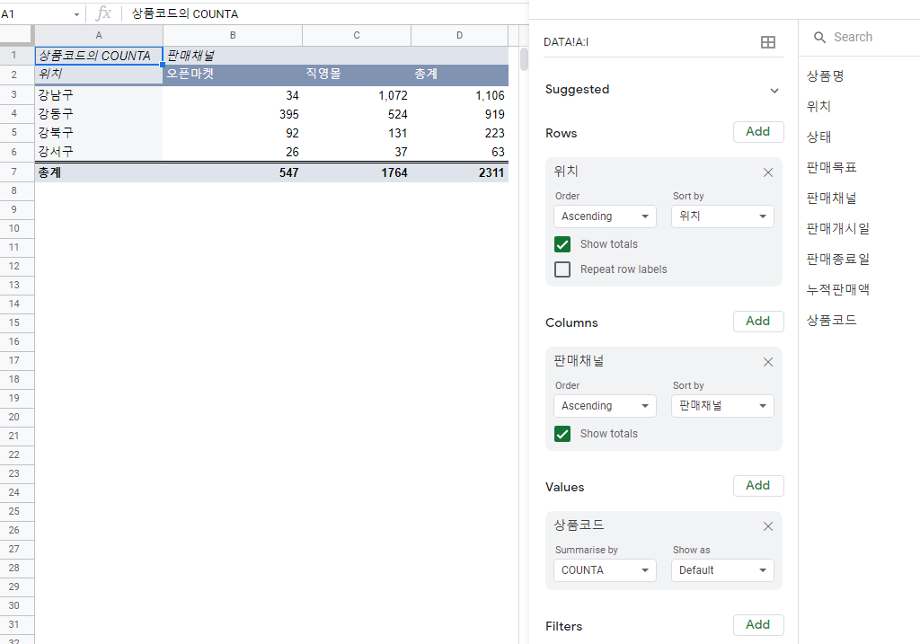 행, 열, 값에 어떤 데이터가 들어갈 것인지 선정해주면 그에 대한 데이터 테이블이 출력된다.