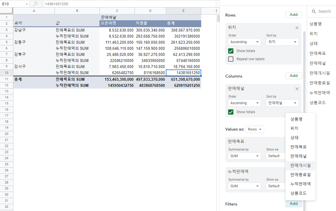 피벗 테이블에 필드 추가 및 레이아웃 변경하기