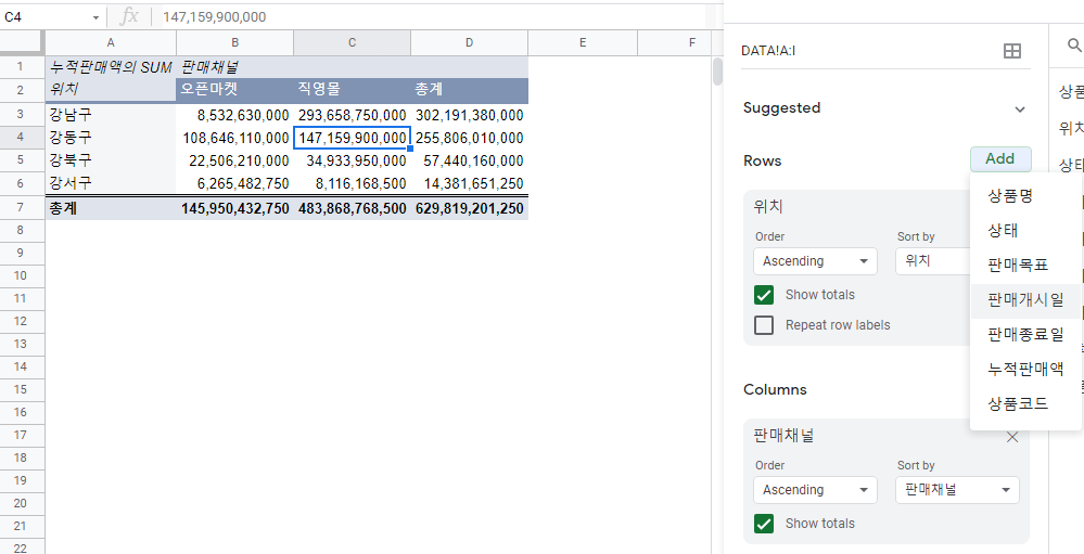 위치 Row의 Sort by 옵션을 바꿔주었다. 그리고 해당 Row를 판매개시일보다 아래로 내려주었다. 정말 근사한 분기별 통계 데이터가 완성되었다.