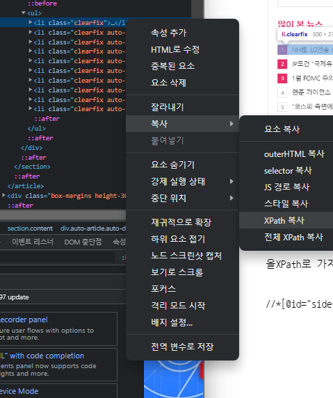 ex) //*[@id=’section_economy’]//ul/li : 문서 전체에서 id 속성값이 ‘section_economy’인 태그 찾아서 그 하위 ul, 그 하위 li 태그를 가져와라.