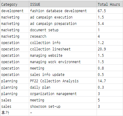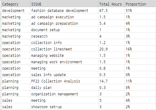 그 다음으로는 컬렉션 분석 업무에 약 11%의 시간을 할애했다. 전 컬렉션들의 판매량, 가격 기록들을 분석하여 다음 컬렉션의 가격 책정, 판매 전략을 수립한다. 효과적인 전략을 수립하기 위해 숙제를 잘 해놓아야 한다. 숙제가 무엇일까. 전략 수립 미팅을 하기 전에 데이터 담당자가 전략 수립에 필요한 데이터들을 모으고 분류하고 이를 정리하는 숙제는 미리 끝내야 한다. 이번 시즌에서 느낀 점은 DB 구축이 완성되지 않은 상황에서 전략 수립에 필요한 데이터를 수집하는 것이 어렵다는 점이다. 다음 시즌이 오기전에 DB 개발을 끝내야겠다는 생각이 든다.