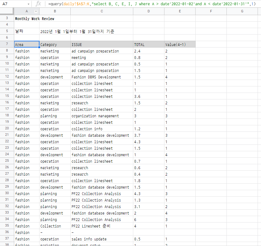 위와 같이 업무 카테고리들을 그룹해주니 2022년 1월에 어떤 업무에 시간을 할애했는데 큰 틀에서 확인할 수 있다.