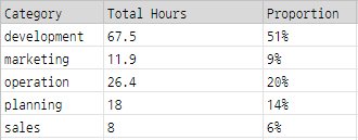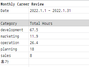 2022년 1월 Development에 할애한 시간은 약 68시간으로 전체 업무량에서 절반 이상을 차지한다. 50%도 아닌 51%라는 점에서 나는 확실히 개발 업무에 열중했다는 점을 강조하고 있는 듯 하다. 그 다음으로 큰 비중을 차지한 업무 카테고리는 operation으로 약 20%을 할애했다. 그 외 planning은 14%, 마케팅은 9% 그리고 sales 관련 업무는 6%로 가장 비중이 낮았다.