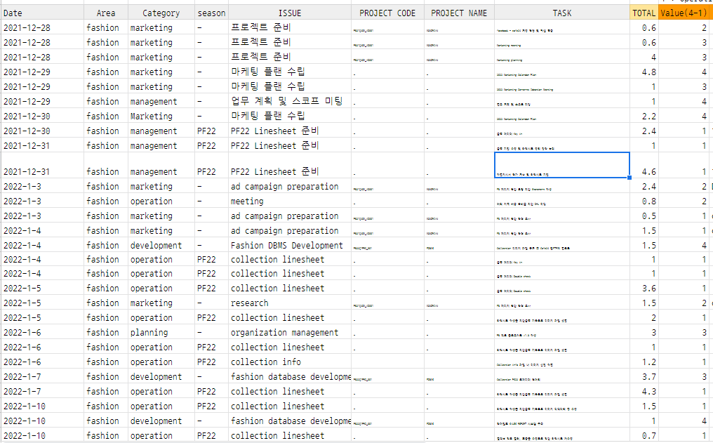 그 다음으로 많이 할애한 업무는 컬렉션 라인시트를 작성하는 operation 업무다. Operation 업무라고 규정한 이유는 라인시트가 브랜드 컬렉션 세일즈를 위해 기본적으로 수행되어야 하는 업무라 생각했기 때문이다. 라인시트는 작업지시서를 기반으로 작성된다. 작업지시서는 디자이너들의 창작물인 디자인이라는 비정형 데이터를 정형 데이터인 숫자로 옮기는 과정에서 핵심이 되는 데이터다. 그 말인 즉슨 비정형 데이터와 관련된 문서를 다루기 때문에 어쩔 수 없이 인간의 단순 노동이 들어갈 수 밖에 없다는 말이다. 그렇기 때문에 아무래도 시간 소요가 많지 않았나 싶다.