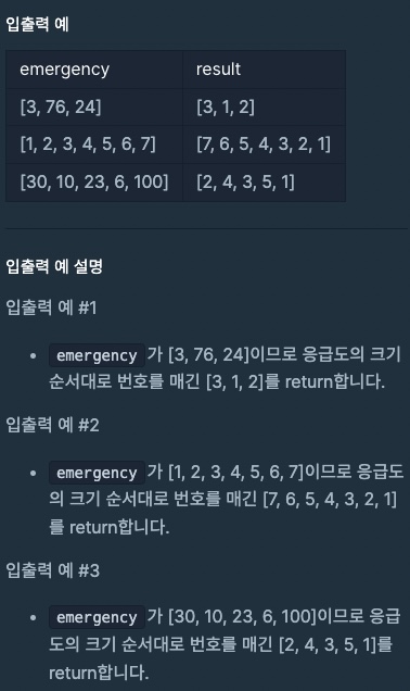 파라미터로 어레이인 [3, 76, 24] 가 주어진 경우, 76이 가장 높은 emergency 이므로 76 -> 1, 24 ->2, 3 -> 3 이렇게 순서를 매기고 이를 순서로 리턴한다.