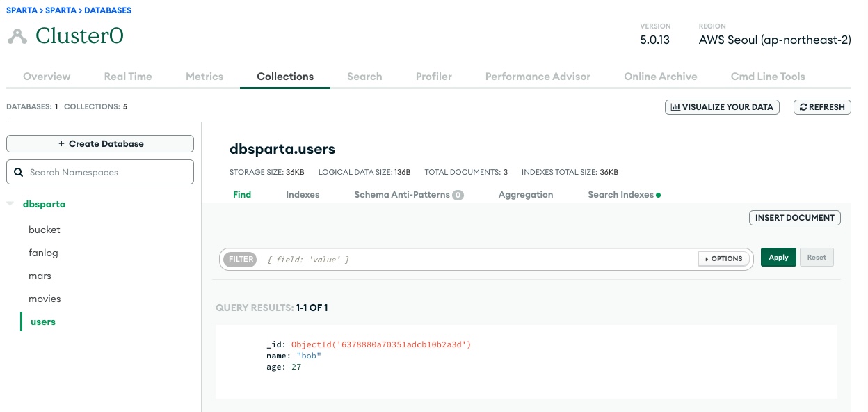 | # 한 개 찾기 - 예시 : 'name' 키에 'bobby' 값을 가진 데이터 1개를 찾아라 user = db.users.find_one({'name':'bobby'}) # 여러개 찾기 - 예시 ( _id 값은 제외하고 출력해줘). 객체로 반환되는 것을 반복문 돌리기 위해서 list화 시킴 all_users = list(db.users.find({},{'_id':False})) |