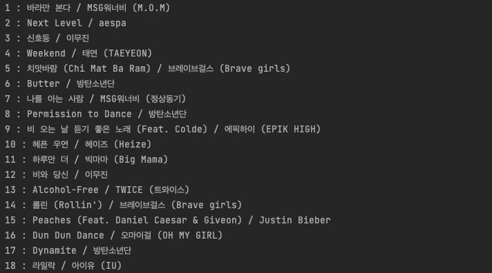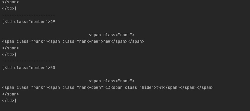| ... for song in songs: rank = song.select_one('td.number').text print('----------------------') print(rank) |