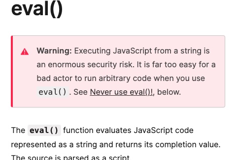 solution에 eval 함수 자체를 대입시켜 풀이했다. eval(input)이 되는 것이다. eval함수는 스트링으로 된 수식을 연산한 값을 리턴하는데, MDN에 따르면 현재 보안상 문제로 사용하지 않을 것을 경고한다.