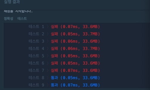 코드 실행에서는 정상적으로 작동하는데 제출하려니 테스트에서 실패한다.