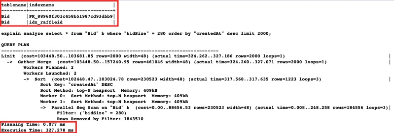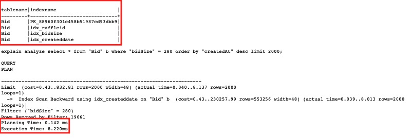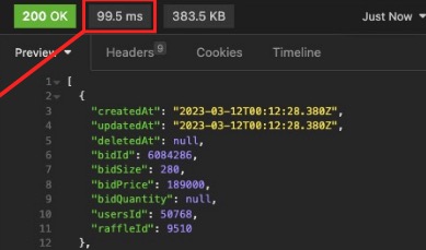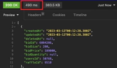 신발 사이즈를 기반으로 고객의 입찰 데이터들을 검색하는 상세 조회(findById) API를 테스트하는 도중 응답속도와 처리량이 급격히 감소하는 현상이 발생했습니다. 이 쿼리는 특정 신발 사이즈(bidSize) 조건과 함께 입찰 생성 날짜(createdAt) 내림차순으로 필터링하고 있던 상황이었습니다. 이에 검색 성능을 개선하고자 신발 사이즈(bidSize)에 인덱스를 적용했으나 성능은 개선되지 않았습니다.