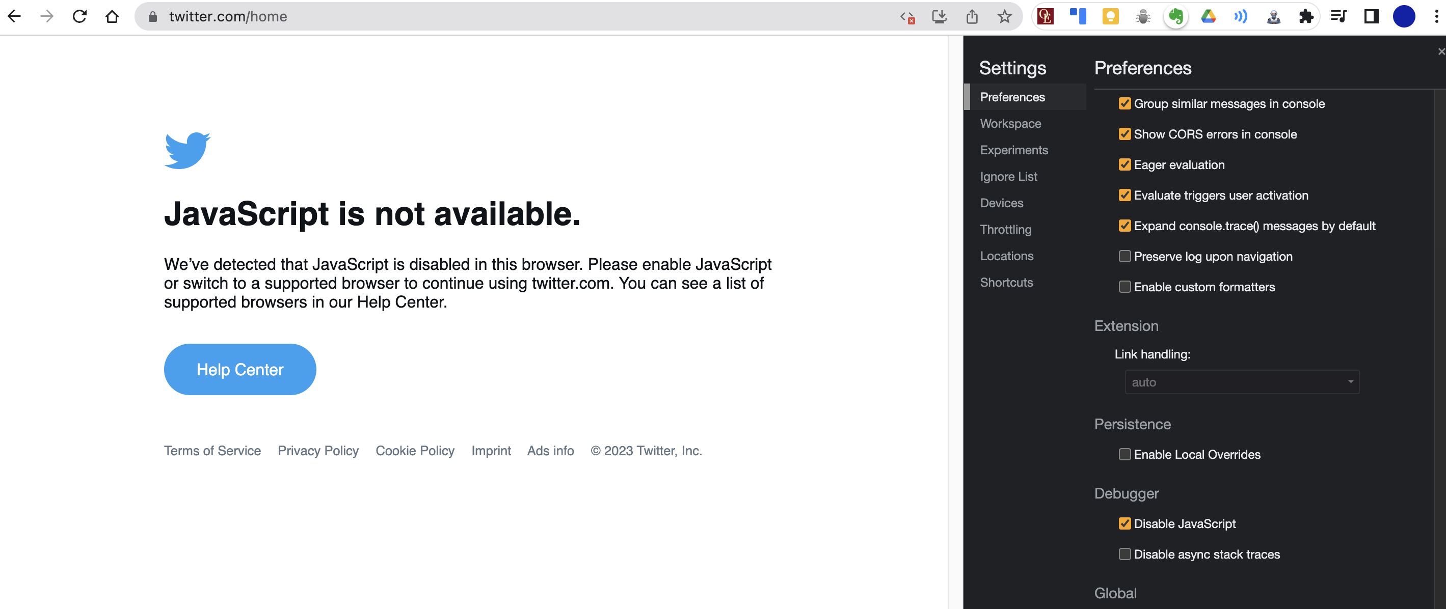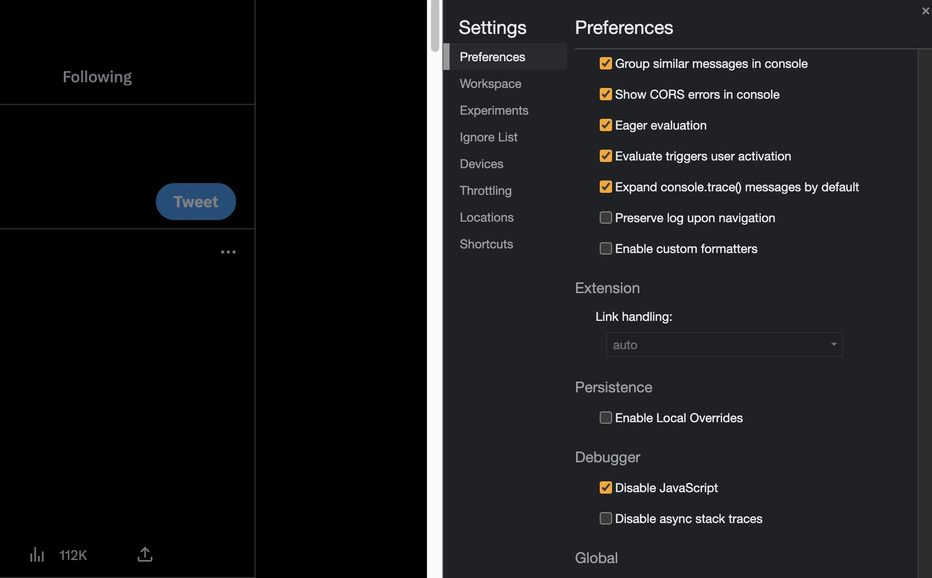 크롬 브라우저 dev toold - settings - Debugger -> Disable Javascript ✅ On 체크해준다