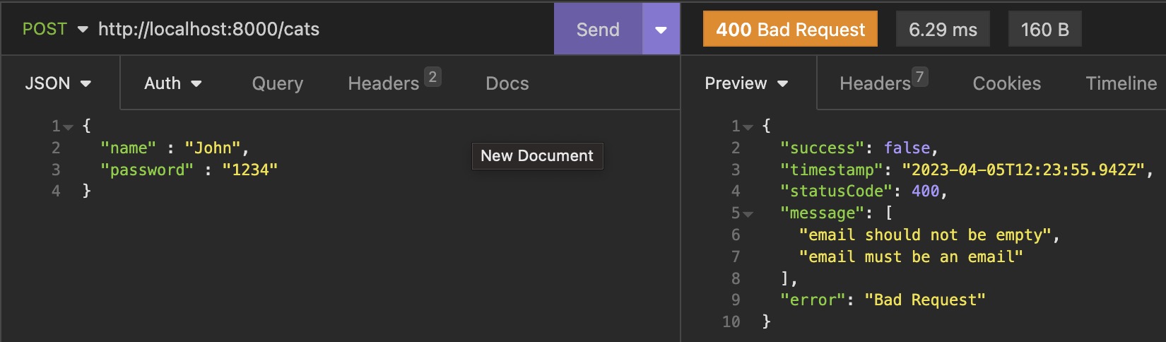 DTO 조건에 맞지 않아(email 프로퍼티 누락) 400 에러를로 응답한다.