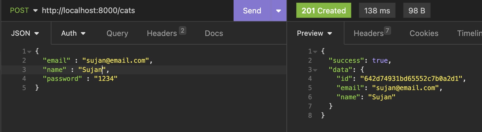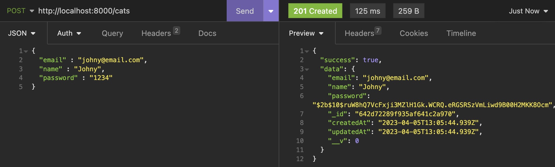 @InjectModel 데코레이터로 Cat 스키마를 생성자 주입받아서, signUp에서 사용한다. 요청 시 전달받은 body 값을 해체하고, 이중 email이 이미 등록된 것인지 확인한 후 등록되었다면 403에러를 반환한다. 만약 등록되지 않았다면, 즉 회원가입이 가능한 상태이면 비밀번호를 해쉬화한 뒤 저장을 완료한다.