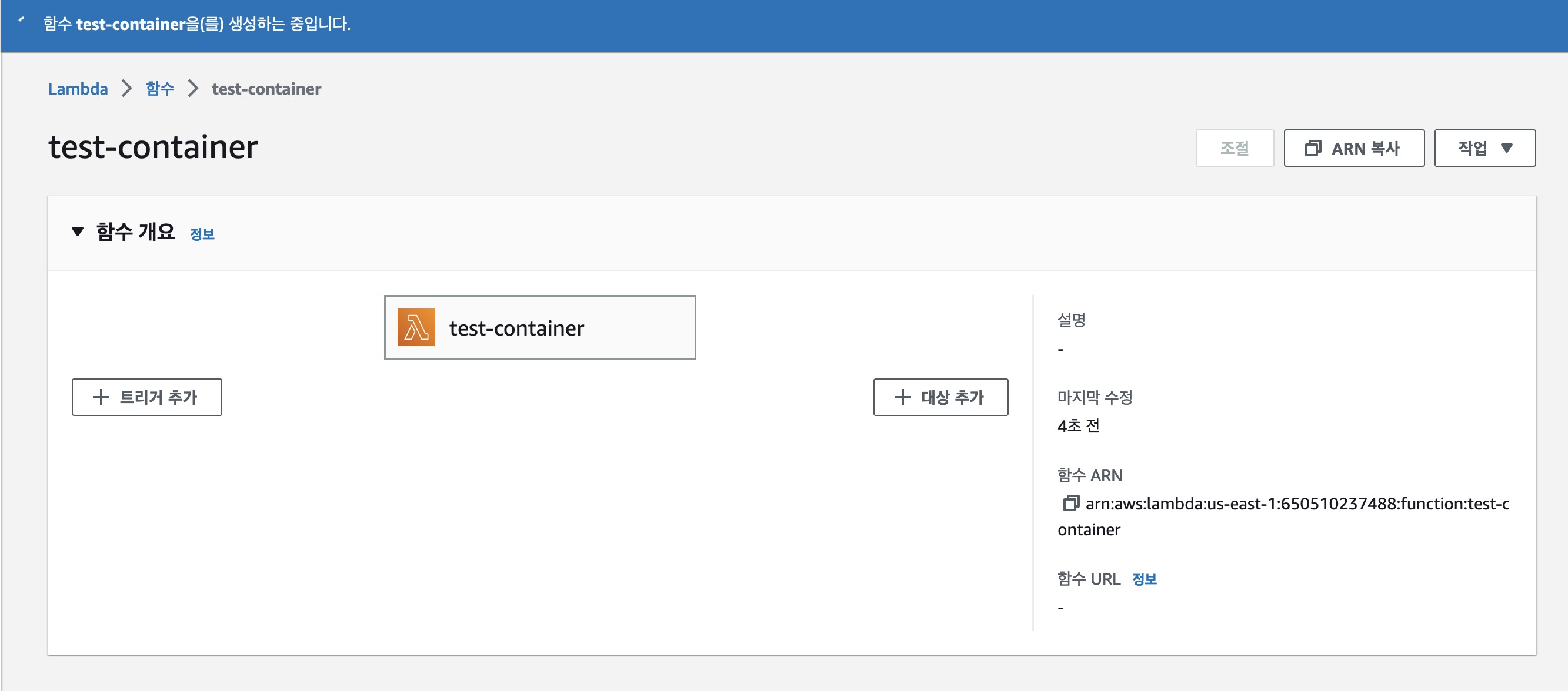 [컨테이터 이미지] 옵션 선택 후 [이미지 찾아보기] 버튼을 눌러 우리가 업로드 했던 리파지토리의 이미지를 올리고 함수를 생성해준다. 아키텍처는 맥북 m1에서 도커이미지를 생성했기 때문에 arm64를 선택해주었다. 그렇지 않다면 x86_64를 선택해주면 된다.