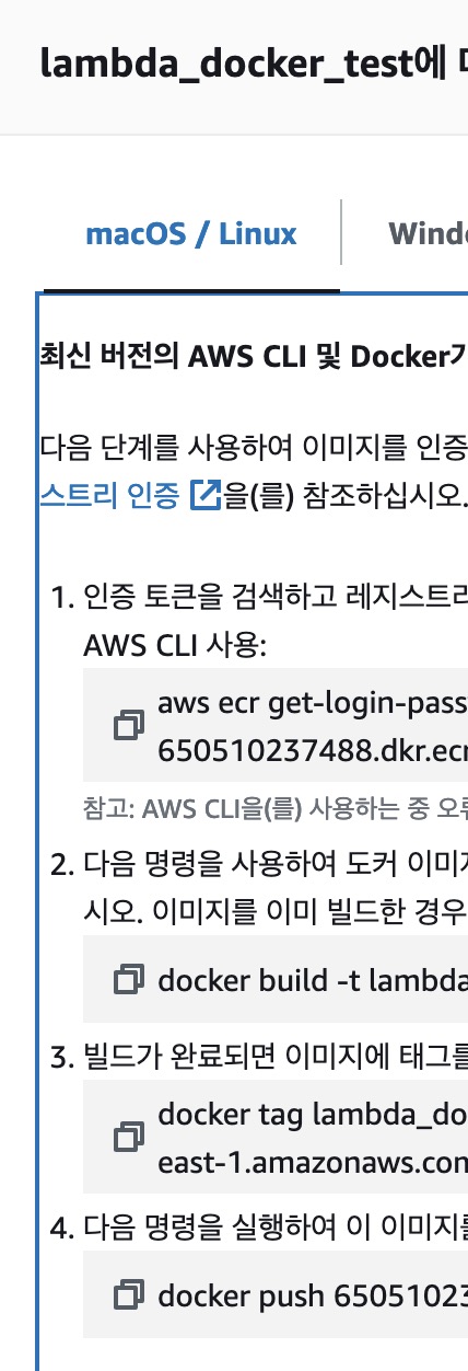 명령어 4개가 나오는데 이를 터미널에서 실행해주면 리파지토리가 자동으로 업로드 된다. 단, Docker은 켜둬야 한다. 왜냐하면 도커 빌드 명령어를 사용하기 때문이다.