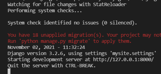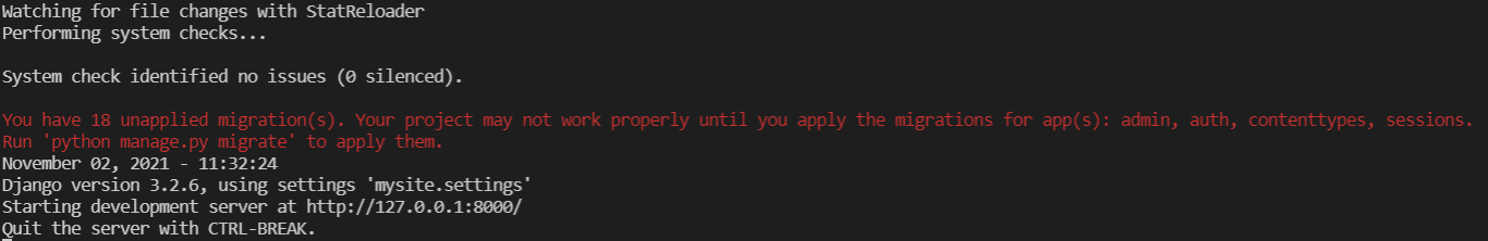 드디어 장고 개발 서버를 막 시작했다. 순수한 파이썬으로만 작성된 가벼운 웹 서버다. Apache와 같은 서버 개발 환경설정없이도 장고를 이용하면 빠르게 서버를 개발할 수 있다. 적용되지 않은 migrations들이 있다는 문구가 뜨지만, 그 외 문구는 특별한 문제가 없어 보인다.