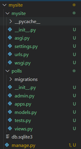 polls 폴더와 sqlite 데이터베이스 파일도 함께 생겼다. 트리구조를 확인해보자.