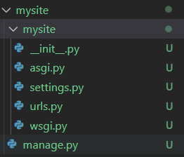 - mysite/ inner directory : 위에 보면 mysite 루트 디렉토리 내에 5개의 파일을 담고있는 mystie 폴더가 하나 더 있다. 지금 설명하는 폴더는 하위 폴더를 지칭한다. 이 폴더는 프로젝트를 위한 파이썬 패키지라고 보면 되겠다. 폴더 이름은 파이썬 패키지를 불러올 때 함께 부르곤 한다. (e.g. mysite.urls)