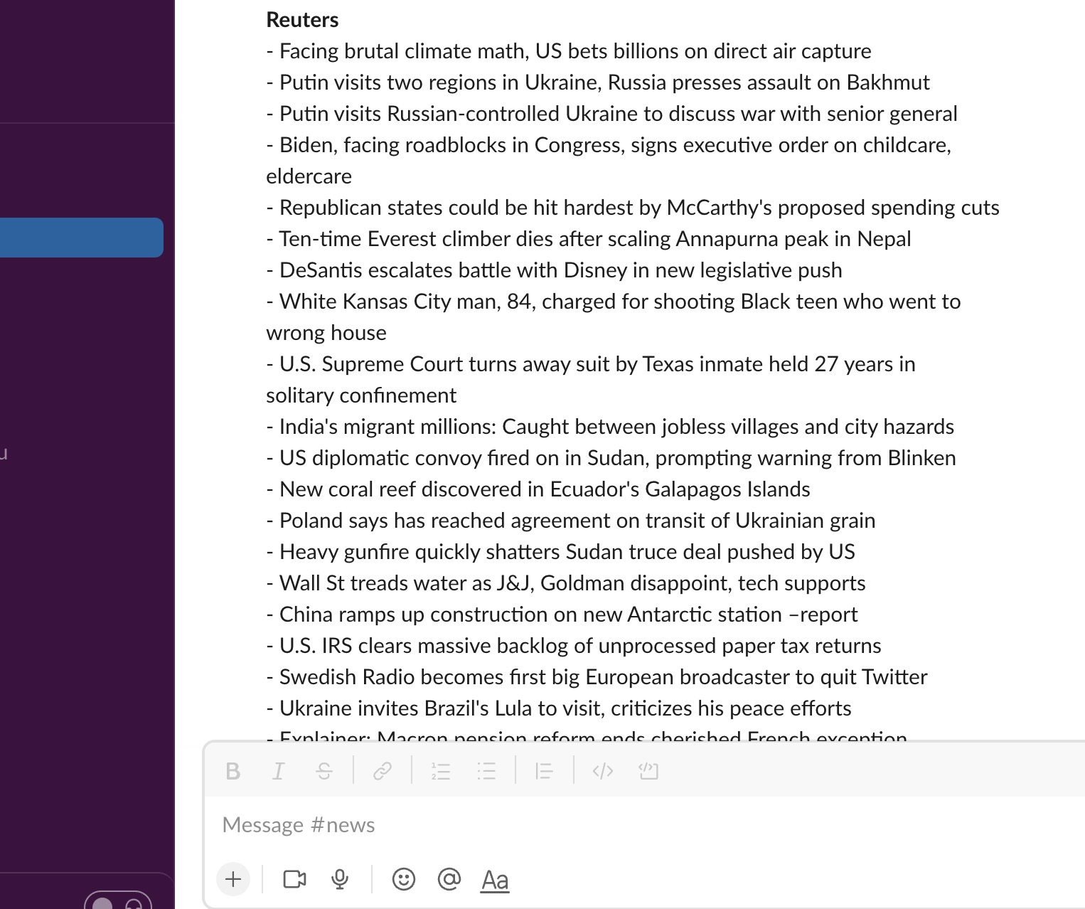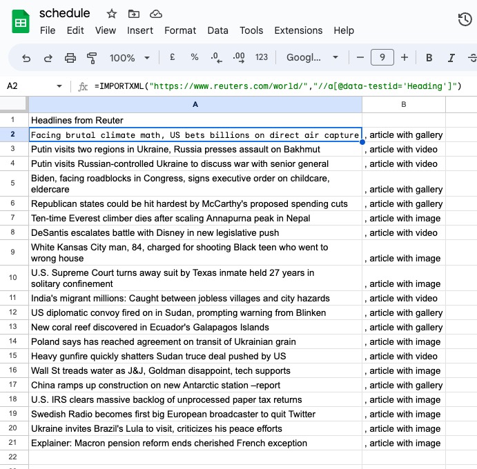 스크래핑 한 구글시트 데이터를 슬랙 메시지로 보낼 것이다. 스크래핑은 구글시트 자체적으로 지원하는 IMPORTXML 함수를 사용해서 데이터를 가져왔다. Slack 메시지는 Slack의 webhook을 사용한다.