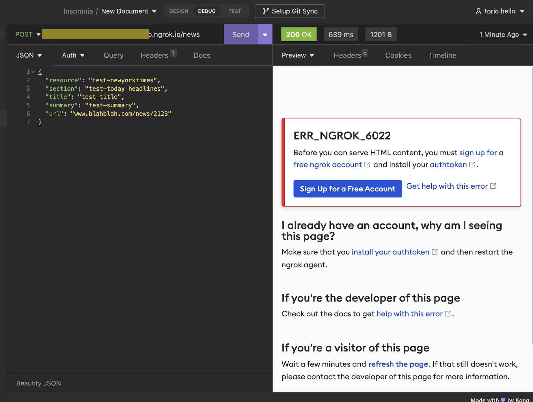 Insomnia로 외부 ngrok으로 호스팅된 웹 주소로 요청해보니, 로컬의 nest.js 서버가 잘 수신한 것을 볼 수 있다.