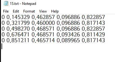 이미지 파일당 하나씩 생기는 레이블 txt파일을 열어보면 위와 같은 데이터가 저장되어 있다. 각 레이블 박스들의 위치정보를 나타내는 것으로 추정된다.