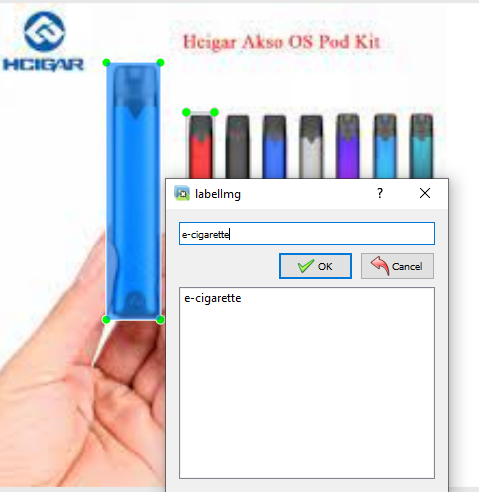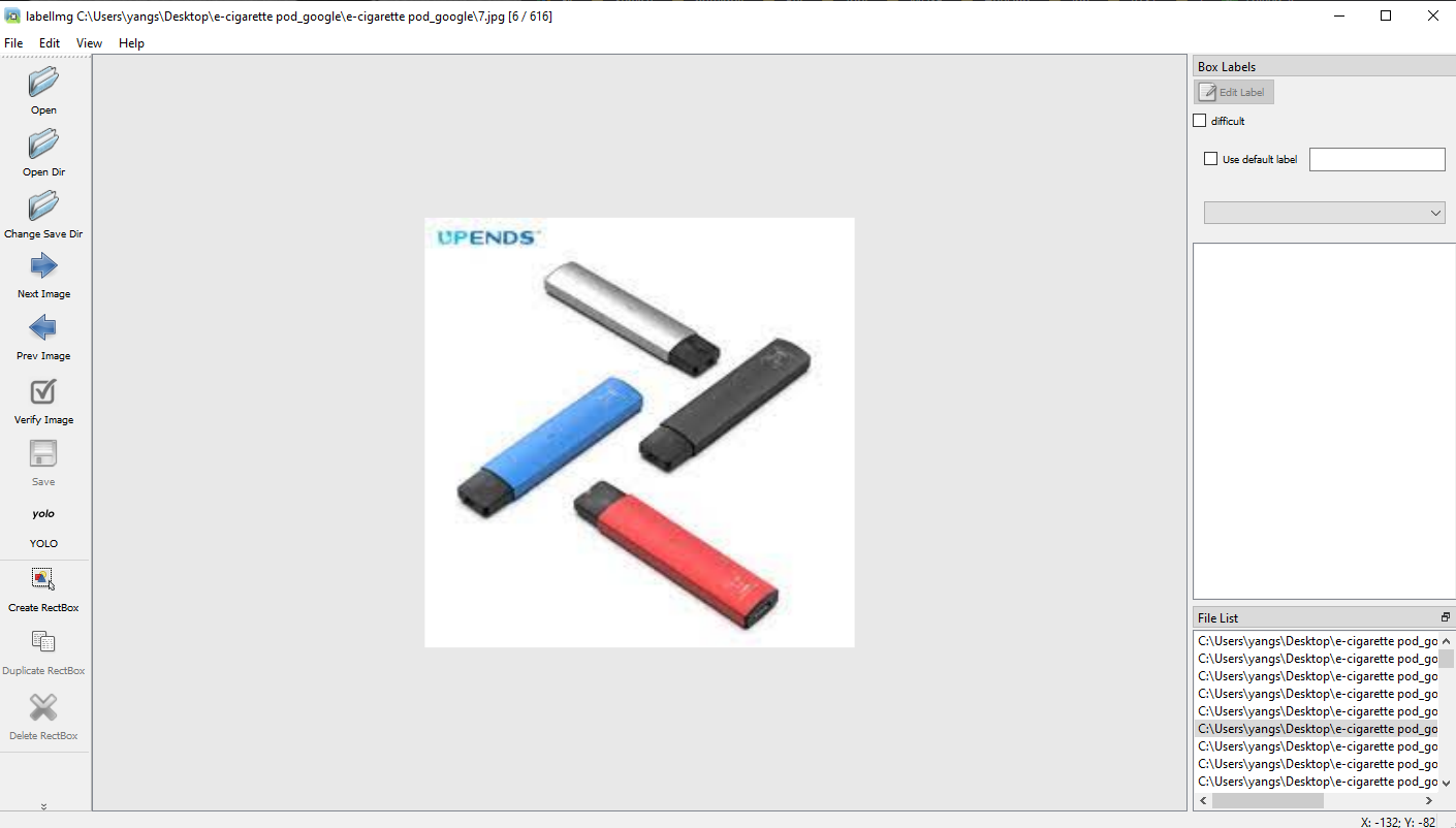 Open Dir로 레이블링할 이미지들이 있는 폴더를 열어주자. 위 이미지들은 구글img에서 크롤링해온 e-cigarette(전자담배) 이미지들이다.