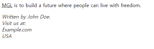 | <p><abbr title="My Goal">MGL</abbr> is to build a future where people can live with freedom.</p> <address> Written by John Doe.<br> Visit us at:<br> Example.com<br> USA </address> |