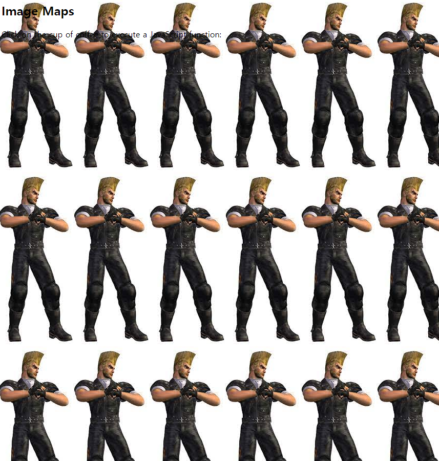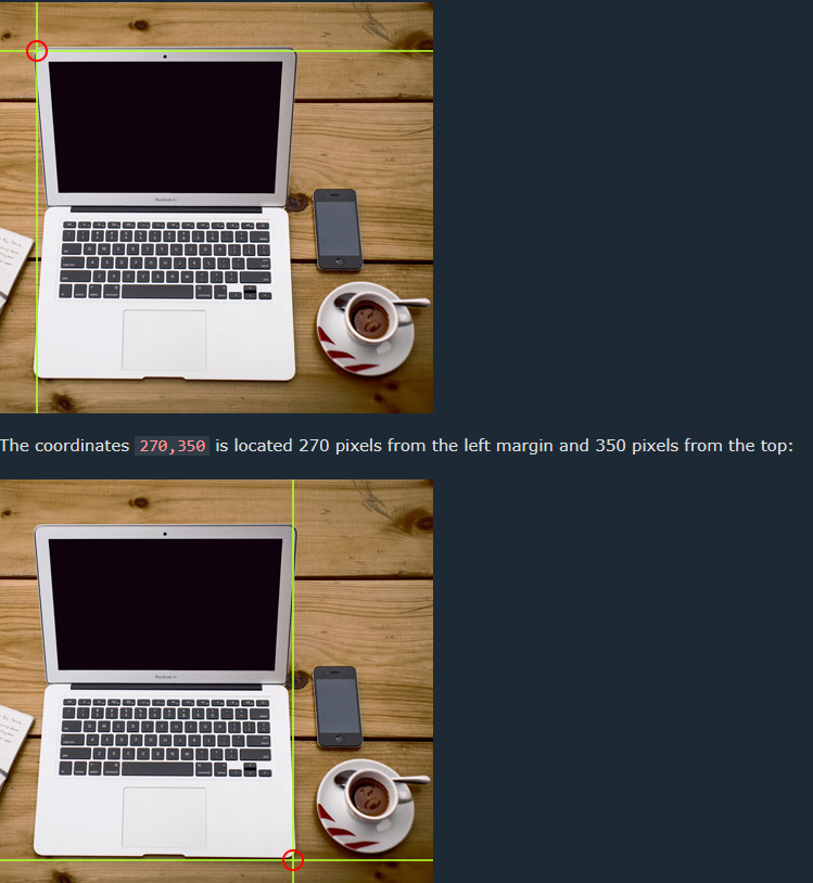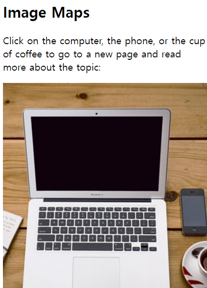 | <!DOCTYPE html> <html> <body> <h2>Image Maps</h2> <p>Click on the computer, the phone, or the cup of coffee to go to a new page and read more about the topic:</p> <img src="workplace.jpg" alt="Workplace" usemap="#workmap" width="400" height="379"> <map name="workmap"> <area shape="rect" coords="34,44,270,350" alt="Computer" href="computer.htm"> <area shape="rect" coords="290,172,333,250" alt="Phone" href="phone.htm"> <area shape="circle" coords="337,300,44" alt="Cup of coffee" href="coffee.htm"> </map> </body> </html> |