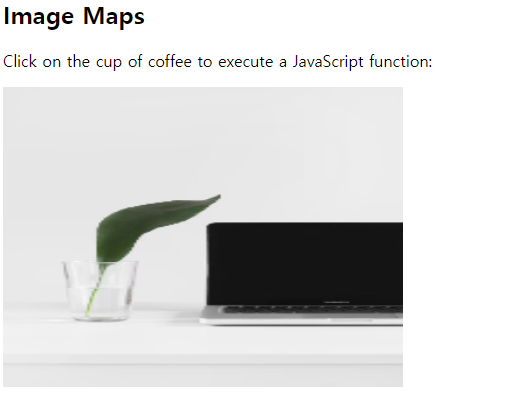 | <html> <head> <title> This is study note no.2 </title> </head> <body> <h2>Image Maps</h2> <p>Click on the cup of coffee to execute a JavaScript function:</p> <img src="https://images.unsplash.com/photo-1471897488648-5eae4ac6686b?ixlib=rb-1.2.1&ixid=MnwxMjA3fDF8MHxwaG90by1wYWdlfHx8fGVufDB8fHx8&auto=format&fit=crop&w=687&q=80" alt="plant" usemap="#plantmap" width="400" height="300"> <map name = "plantmap"> <area shape="circle" coords="100,100,50" href="naver.com" onclick="myFunction()"> </map> <script> function myFunction() { alert("You clicked the coffee cup!"); } </script> </body> </html> |
