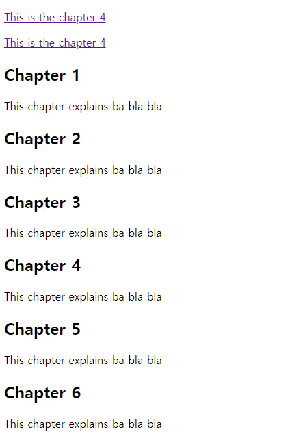 | <body> <p><a href="#C4">This is the chapter 4</a></p> <p><a href="#C10">This is the chapter 4</a></p> <h2>Chapter 1</h2> <p>This chapter explains ba bla bla</p> <h2>Chapter 2</h2> <p>This chapter explains ba bla bla</p> <h2>Chapter 3</h2> <p>This chapter explains ba bla bla</p> <h2 id="C4">Chapter 4</h2> <p>This chapter explains ba bla bla</p> ... <h2>Chapter 23</h2> <p>This chapter explains ba bla bla</p> </body> |