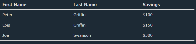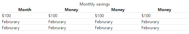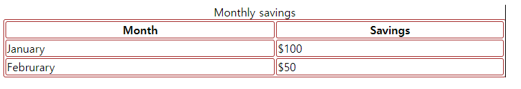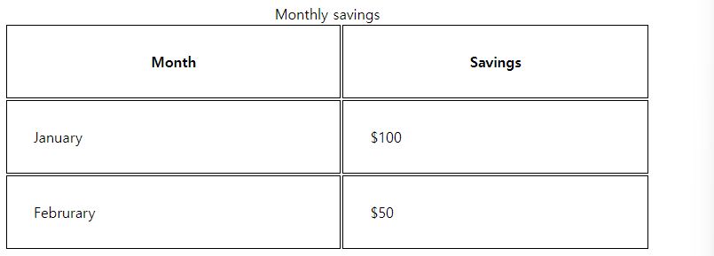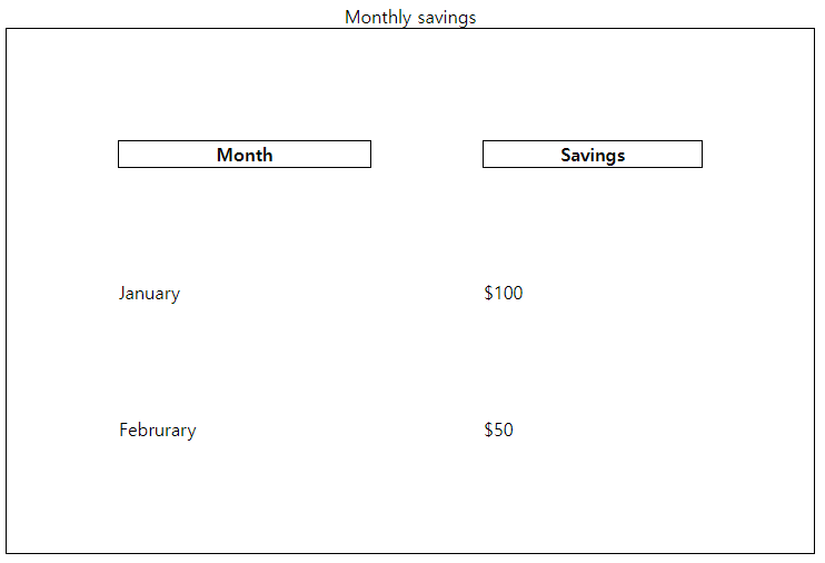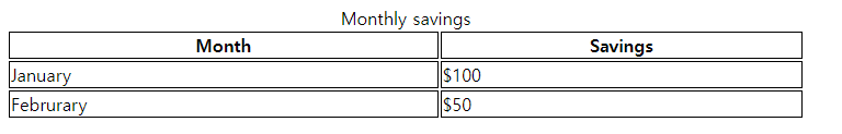 | <table style="width:90%"> <caption>Monthly savings</caption> <tr> <th>Month</th> <th>Savings</th> </tr> <tr> <td>January</td> <td>$100</td> </tr> <tr> <td>Februrary</td> <td>$50</td> </tr> </table> |