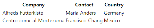 | <table> <tr> <th>Company</th> <th>Contact</th> <th>Country</th> <tr> <tr> <td>Alfreds Futterkiste</td> <td>Maria Anders</td> <td>Germany</td> </tr> <tr> <td>Centro comcial Moctezuma</td> <td>Francisco Chang</td> <td>Mexico</td> </tr> </table> |