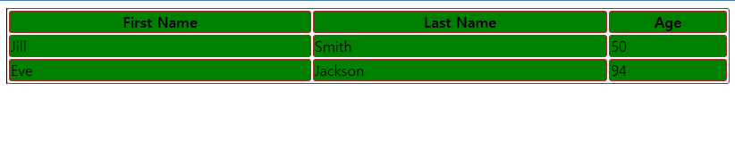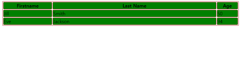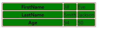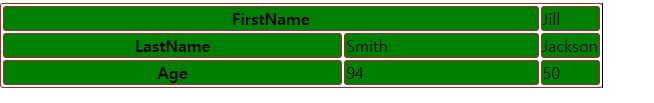 | <table> <tr> <th colspan="2" style="width:90%">FirstName</th> <td>Jill</td> </tr> <tr> <th>LastName</th> <td>Smith</td> <td>Jackson</td> </tr> <tr> <th>Age</th> <td>94</td> <td>50</td> </tr> </table> |