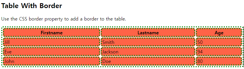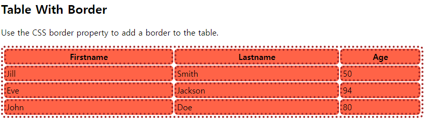 | <style> table, th, td { border: 4px solid green; border-radius: 7px; border-style: dotted; } th, td { background-color: tomato; } </style> |