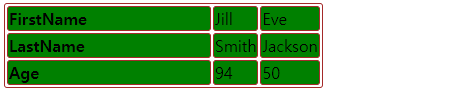| <table> <tr> <th style="width:200px">FirstName</th> <td>Jill</td> <td>Eve</td> </tr> <tr> <th>LastName</th> <td>Smith</td> <td>Jackson</td> </tr> <tr> <th>Age</th> <td>94</td> <td>50</td> </tr> </table> |