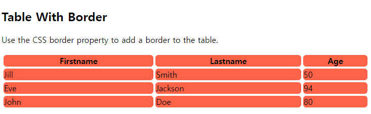 | <style> table, th, td { border: 1px solid white; border-radius: 7px; } th, td { background-color: tomato; } |