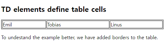 | <!DOCTYPE html> <html> <style> table, th, td { border:1px solid black; } </style> <body> <h2>TD elements define table cells</h2> <table style="width:100%"> <tr> <td>Emil</td> <td>Tobias</td> <td>Linus</td> </tr> </table> <p>To undestand the example better, we have added borders to the table.</p> </body> </html> |