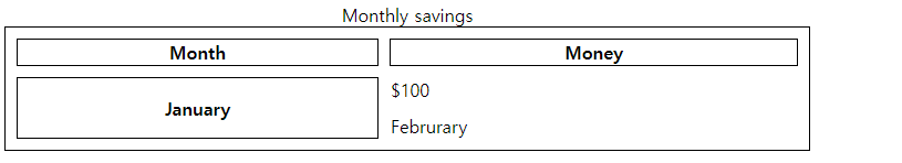 | <table style="width:90%"> <caption>Monthly savings</caption> <tr> <th>Month</th> <th>Money</th> </tr> <tr> <th rowspan="2">January</td> <td>$100</td> </tr> <tr> <td>Februrary</td> </tr> </table> |