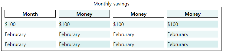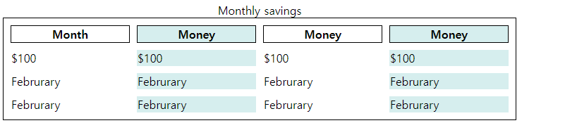 | <table style="width:90%"> <caption>Monthly savings</caption> <tr> <th colspan="2">Month/Money</th> </tr> <tr> <td>January</td> <td>$100</td> </tr> <tr> <td>Februrary</td> <td>$50</td> </tr> </table> |