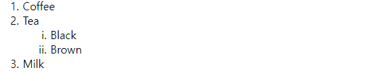 | <BODY> <ol> <li>Coffee</li> <li>Tea <ol type="i"> <li>Black</li> <li>Brown</li> </ol> </li> <li>Milk</li> </ol> </BODY> |