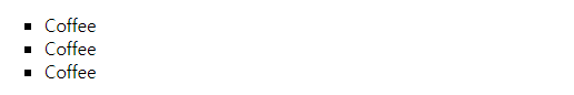 | <ul style="list-style-type:square;"> <li>Coffee</li> <li>Coffee</li> <li>Coffee</li> </ul> |