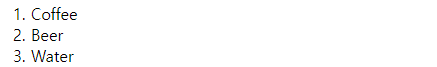 | <ol> <li>Coffee</li> <li>Beer</li> <li>Water</li> </ol> |