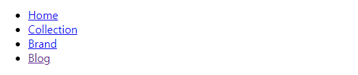 | <ul> <li><a href="#home">Home</a></li> <li><a href="#collection">Collection</a></li> <li><a href="#brand">Brand</a></li> <li><a href="#blog">Blog</a></li> </ul> |